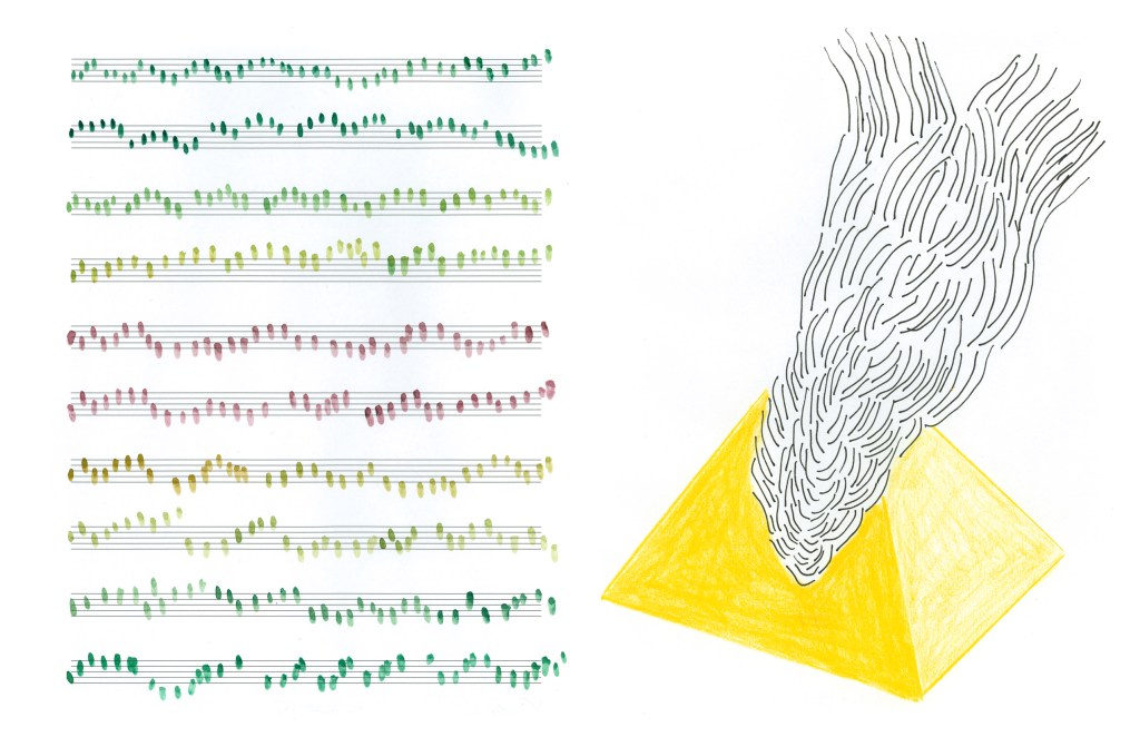 40 watercolors on musical score paper and 40 sacred geometry drawings in black ink and colored pencil.
