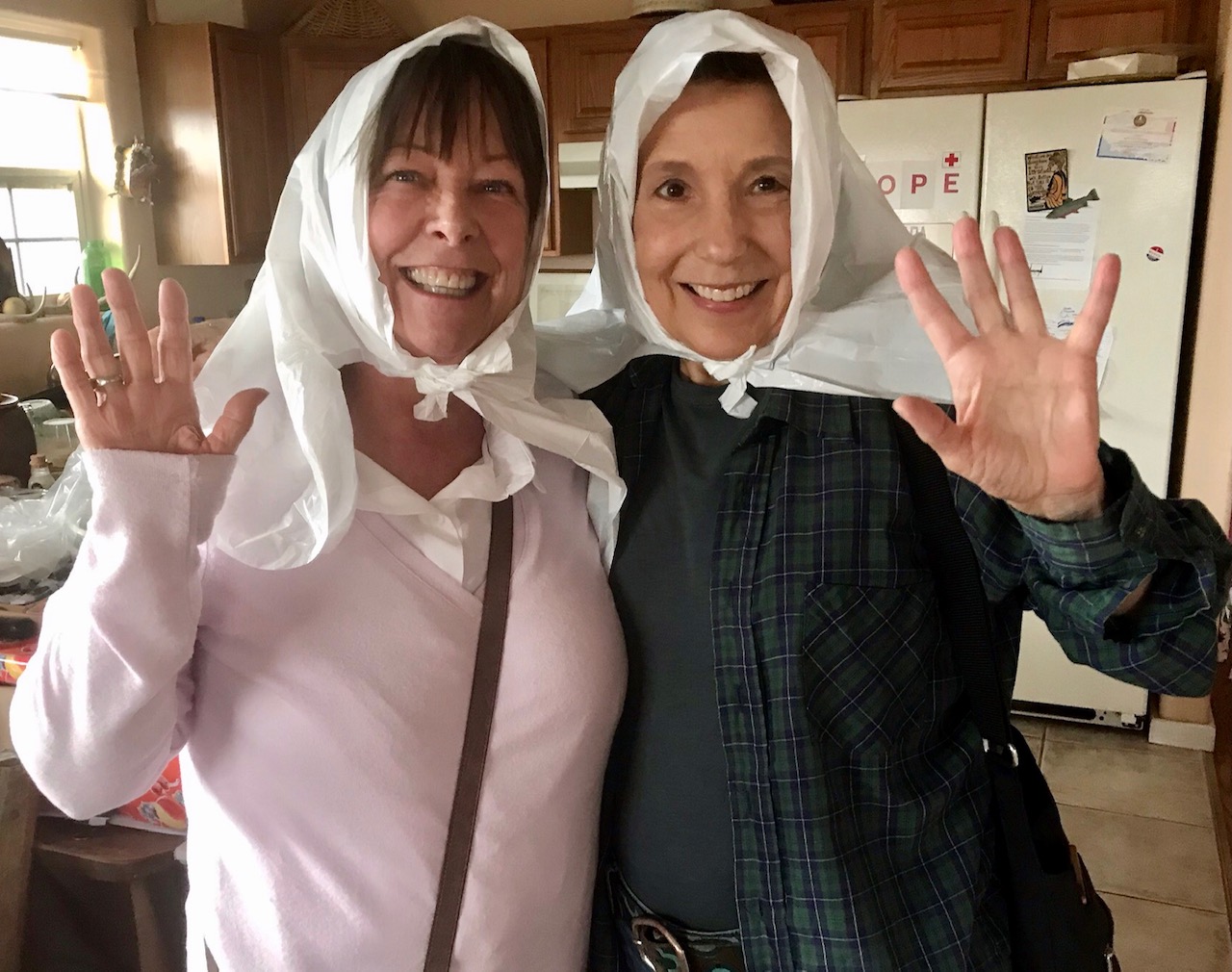 Dear Life, The wind howled and the clouds opened up in Galisteo yesterday where Jacqueline and I were visiting a friend who makes healing soups for me. She offered us “garbage bags” to keep our pretty little heads dry. I no longer have a fear of being a bag lady. How cute are we?!?