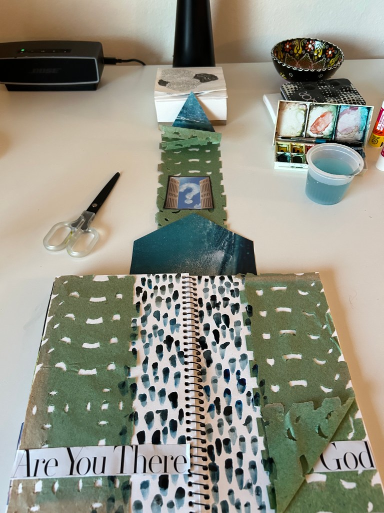 Dear Life, When I feel the “energy drainers” hit me, I know it’s time to meet the challenge with creativity. Ask the hard questions then fearlessly (or with trepidation) open up to answers through curiosity, resiliency, unearthing disbelief, falling to pieces and then building a new container that lets the light come through the cracks. Yesterday I sat in my home studio and let my spirit find its way through collage and watercolor. The Chinese papers with torn and faded edges gave way to blue-black watercolor tears. Music (thank you, Jon Batiste) soothed the deep question… Are You There, God? I heard, YES.