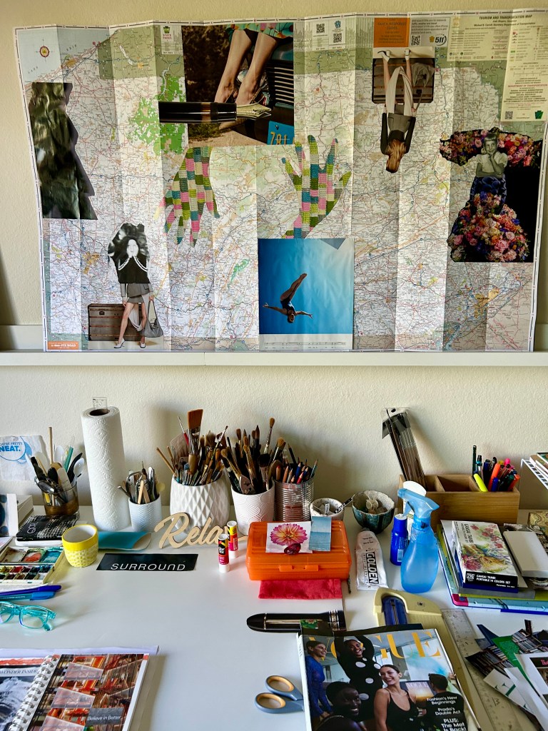 Dear Life, I am doing a series of collages using maps I collected during my summer road trip. Here is Pennsylvania in progress. I will submit this to my Contemporary Figurative Projects class. It shows how the “figure” is elemental in mapping one’s life, past and present, while offering a glance towards the future: travel, writing, creating art, being in beauty. The caption in the lower center reads: “there she is ____ walking on air ____ she is”.