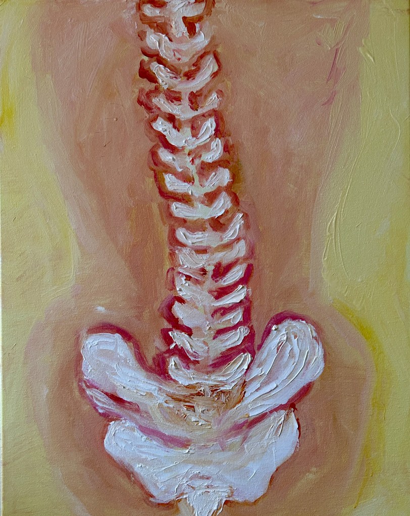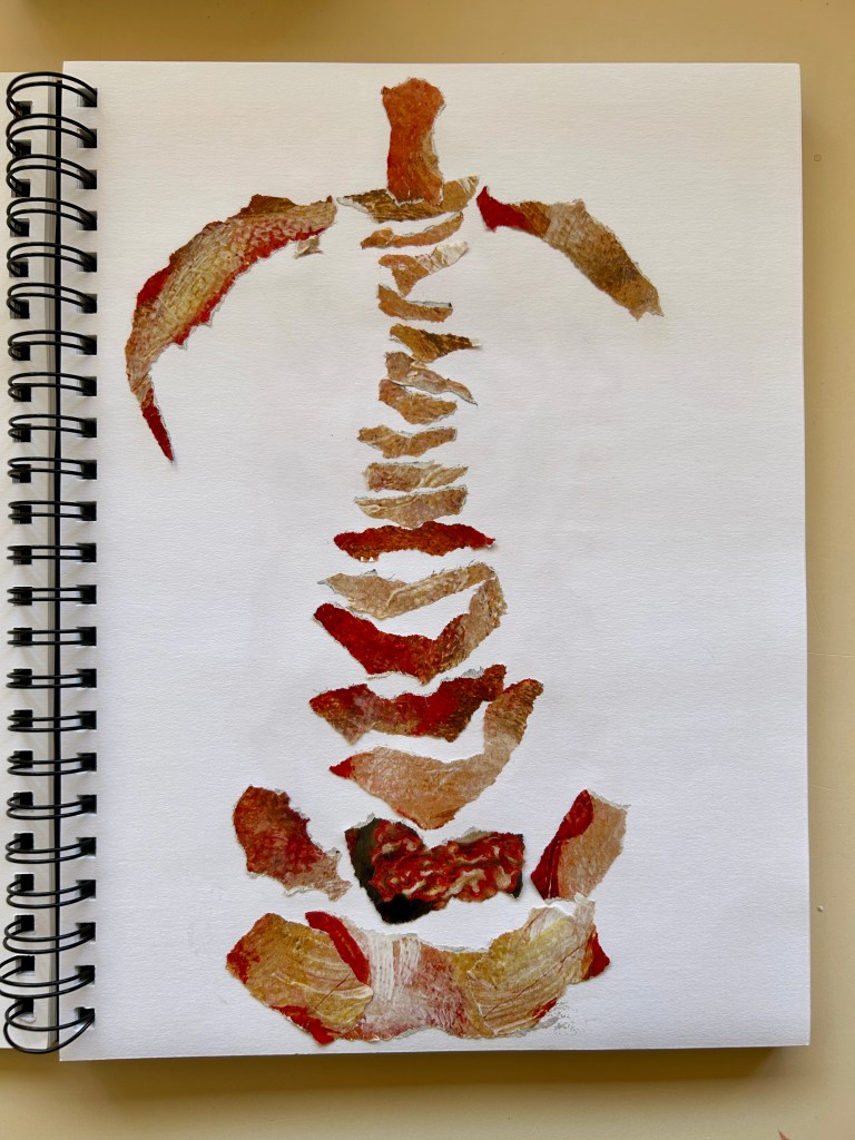 Dear Life, Given the prompt to paint a self-portrait, I decided to start from the inside-out. I made an ink drawing, moved to collage, and then painted my spine. Over the 5 years of cancer treatments and aging, my spine has developed a slight curve and I’ve shrunk an inch. What goes on in the inside eventually shows up on the outside. At 5’3″, I may be petite but it doesn’t diminish my big Life Force.
