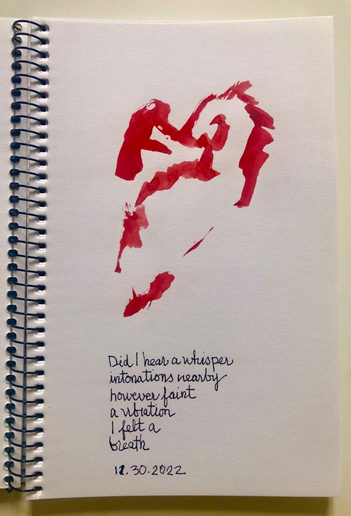 Dear Life, Walking through the studio I said to a friend, “I’m not doing any art”. She pointed to a book on my art table and asked, “What’s that?” I opened the pages and showed her some ink and watercolor word poems. We laughed. She smiled. “That’s nothing?” No, it’s something. My hand is always moving even though my head says, “You are doing nothing”. Plight of an artist.