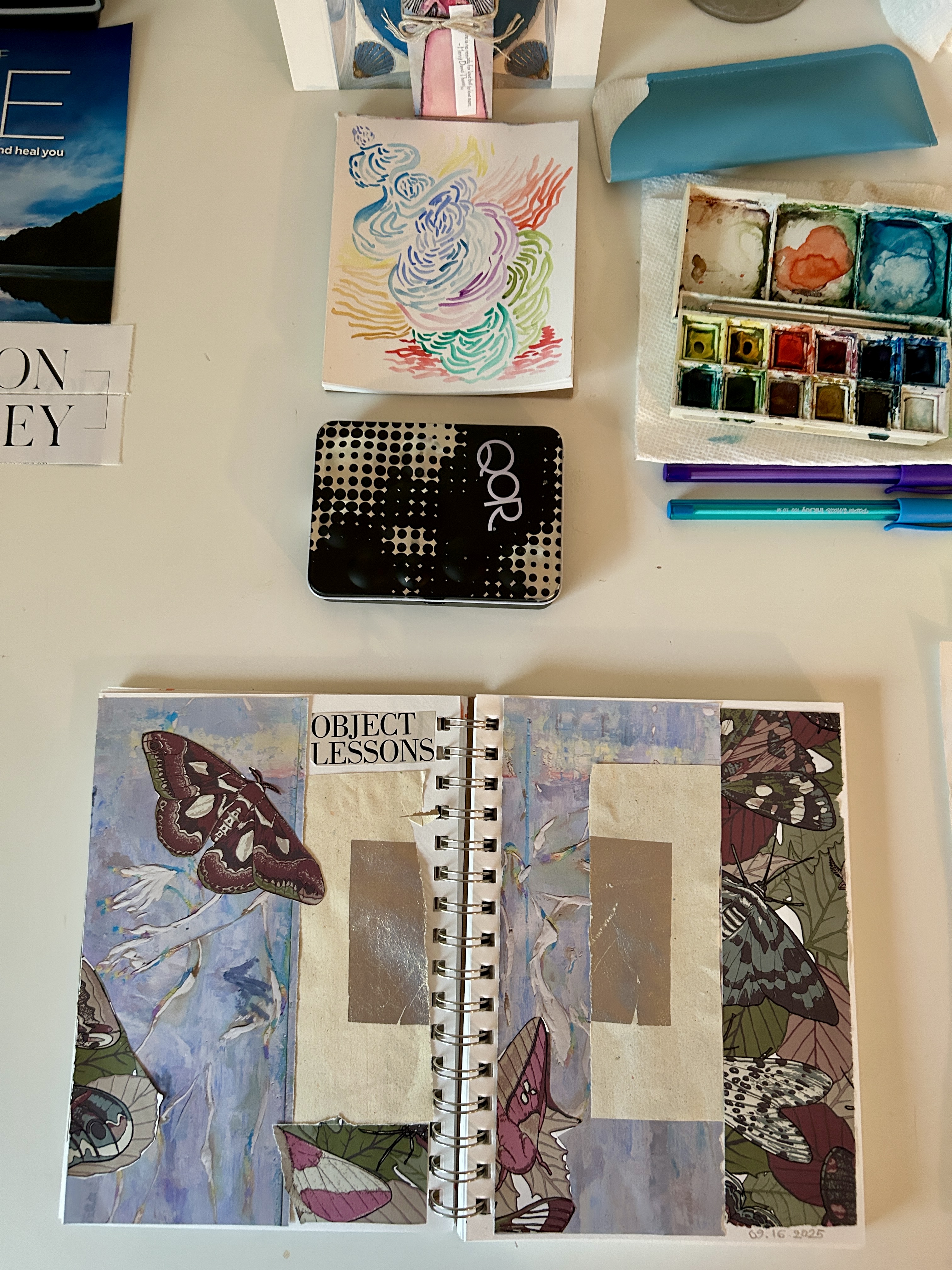 Dear Life, Here are two walls of the studio. Work is happening on a daily basis: collage, painting, drawing, experimenting with transfers of prints to canvas. And a corner near the big window is a growing Vision Board. I am grateful to have this studio in the Santa Fe Community College art department. I enjoy the students and staff, our visits and classes. Inspirational.